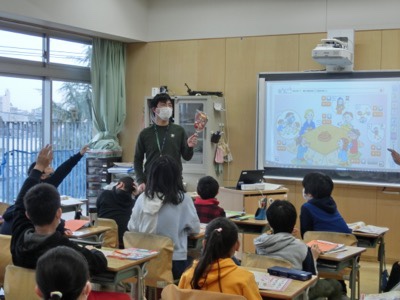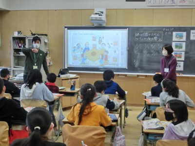 5-2の担任の澤先生とJTEのギベス先生の英語の授業です。日本の文化について英語で紹介する会話を聞いて、質問に答える活動をしていました。