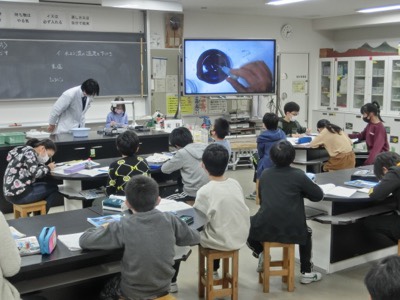 理科室では5-1が水溶液から溶けているものを取り出す実験をしていました。顔を寄せ合ってする実験のような活動はできないので、代表の子が操作する手元を画面に大きく映して見せています。緊急事態宣言の中、感染防止に配慮した活動を続けていきます。