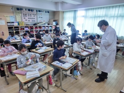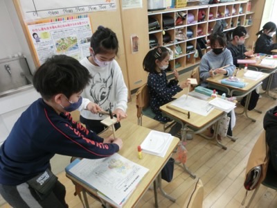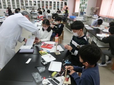 済美教育センターの理科指導員の先生方が、学校で実験の指導をしてくれる「理科出前授業」。今日は3年生の各クラスが「電気の通り道」の発展学習として、豆電球とスイッチを使ったおもちゃ作りの学習をしました。