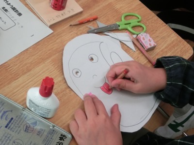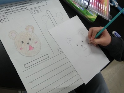 自分で書いた設計図に沿って、厚紙に絵を描きます。この子は、クマの耳が光るおもちゃを作るようです。