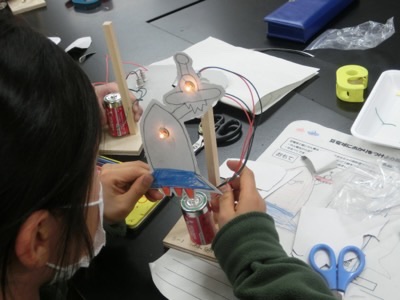 「光った!」と喜ぶ子どもたち。楽しみながら、電気がどのように流れて豆電球が光るのかを学ぶことができました。