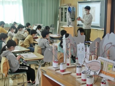 道徳の授業をしている3-3の教室の前には、昨日の理科出前授業で作った豆電球のおもちゃが並んでいました。