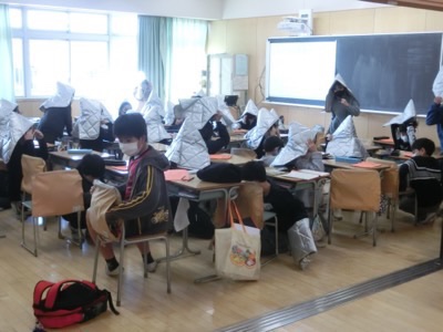 教室ではすぐに防災頭巾を広げてかぶっていました。コロナ禍での訓練なので、全員が校庭まで避難するのは中止にしました。どんな時に災害が起きても命が守れる行動を取るように、これからもさまざまな避難訓練を続けていきます。