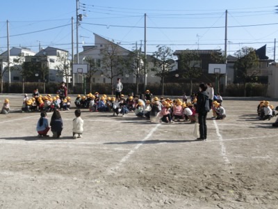 理科室から出火という放送を聞いて、校庭で遊んでいた子どもたちは真ん中に集まって座りました。何かがあったらすぐに立って逃げられるように、片膝を着いた座り方を「忍者座り」と呼んでいます。