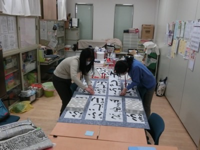 学校支援本部(AW)のみなさんが、書き初めを雲華紙に貼りつけてくださっています。毎年、書き初め展の前に、AWサポーターが集まって作業してくれるのです。