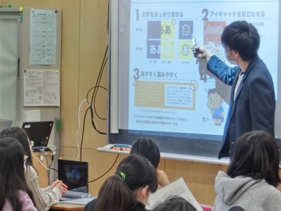 5年生の「天沼会社経営プロジェクト(AKP)」は、宣伝と販売に向けた取組に入りました。企業の方を講師として、ポスターの製作について学んでいます。