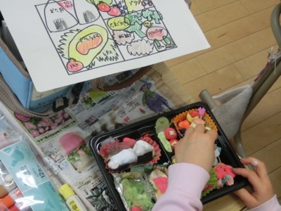 一人一人設計図を描いて、そのとおりに紙粘土で食べ物を作って詰めていきます。「楽しそうだね」と言ったら、口々に「楽しいよー」と言っていました。