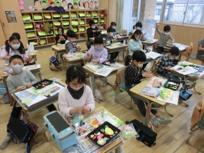 1-2は図工です。紙粘土でお弁当を作っていました。