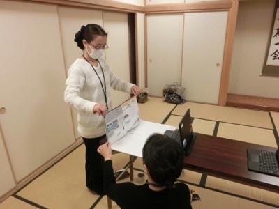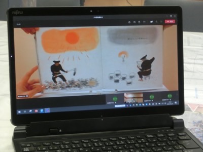 学校支援本部(AW)のサポーターが、こうやって和室からオンラインで読み聞かせをしてくれるのを教室で聞くことができるのです。