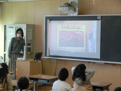 お話の後は読み聞かせです。こちらは2-3です。プロジェクターで絵本を映し、「100まんびきのねこ」を読んでもらいました。