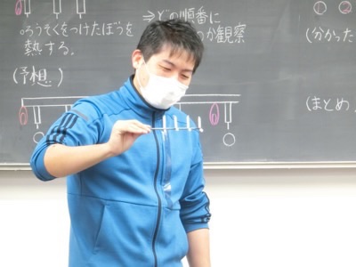 理科室では、4-2が金属のあたたまりかたについての実験をしていました。
