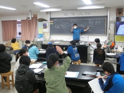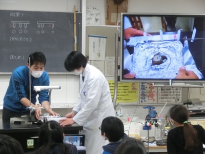 理科専科の高野先生と実験をする様子を、大画面に映して観察しました。