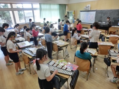 2-1は音楽で合奏をしていました。感染防止のため、「吹かない楽器」を使って演奏をしています。