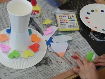 模様を描いたり、色紙を貼り付けたりして楽しそうに作っていました。