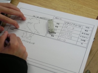 6-3は社会科で世界各国について一人ずつ学習をしていました。資料集やタブレットからの情報を整理しています。