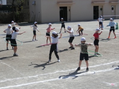 校庭で、2-1と2-2が体育をしていました。フラフープを置いて、中に入ったり左右に出たりリズムに合わせてジャンプしています。