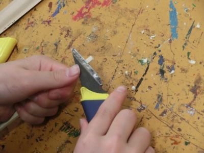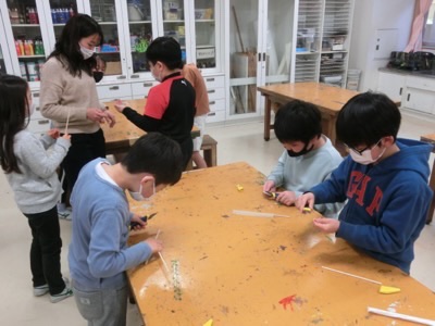 絵の具で描くペンを作るために、割り箸の先を尖らせています。