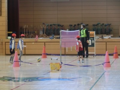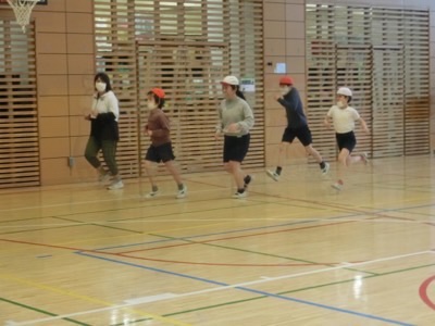 アリーナではこだま学級が体育をしていました。アリーナの壁に沿って走って準備運動をします。