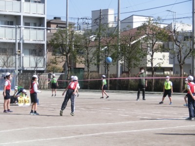 校庭で5-2の澤先生が体育をしていますが、子どもたちは4-2のようです。体育を研究している澤先生がクラスを借りて、校庭の広いスペースでキャッチバレーをする活動を指導しています。