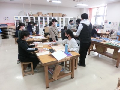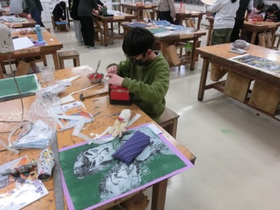 「1枚の板から」の工作を仕上げています。「卒業版画」を作っている子もいます。