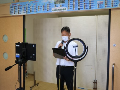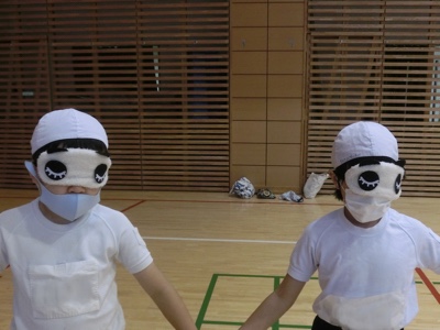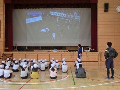 今日は4年生がブラインドサッカーの体験をしました。視覚障害や聴覚障害のある学生を対象とした筑波技術大学の先生が指導に来てくださいました。まず、ブラインドサッカー日本代表の試合を見せてもらいました。