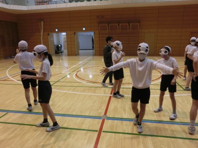 番号でグループ分けをして、自分のグループの仲間がどこにいるか探しながら集まる活動をしてみました。どのように声をかければ集まれるのか考えながら動いています。