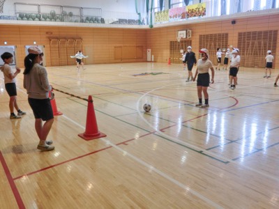 ブラインドサッカーのボールを使ってシュートをしてみました。ブラインドサッカーのボールには音が出るように鈴のようなものが入っています。また、左右のゴールポストがどこなのか、手を叩いて音を出して指示をします。