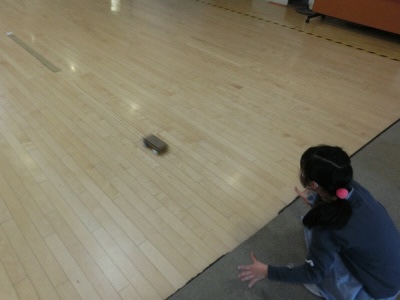 ゴムを使って、エントランスで走らせていました。
