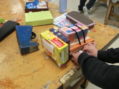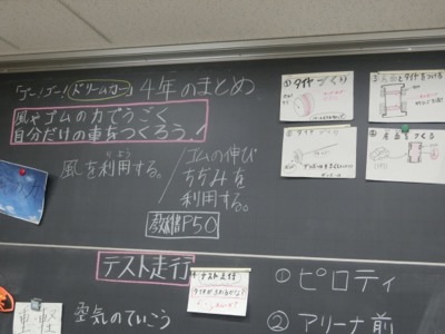 4年生の最後の製作は「ゴー!ゴー!ドリームカー」。風やゴムの力で動く自分だけの車を作ろうという活動です。