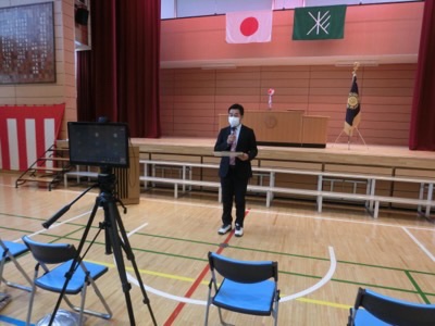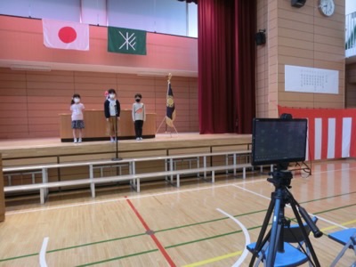 緊急事態宣言は明けましたが、アリーナに全児童が入って修了式を行うことはできません。オンラインで修了式を行いました。学年の代表の子どもに修了証を渡す様子を教室に配信しました。