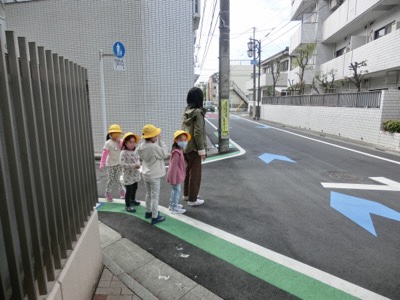今日は、1年生が集団で道路を歩く練習をしました。警察の方がいらっしゃって、はじめに道路標識や歩き方の説明をしてくれました。