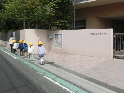 グループごとに学校を出発します。保護者のみなさんが付き添ってくださいました。ありがとうございます。