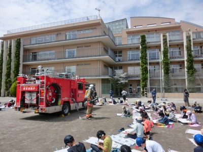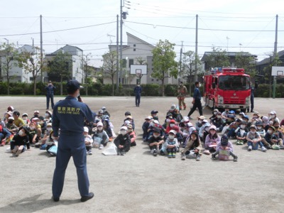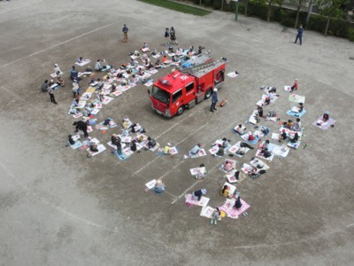 消防署の協力により、今日は2年生の消防写生会です。はじめに、消防署の方の説明がありました。校庭にポンプ車が乗り入れるのを脇で見ていた1年生が興奮していました。