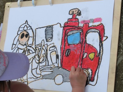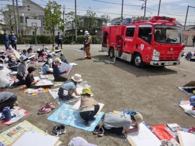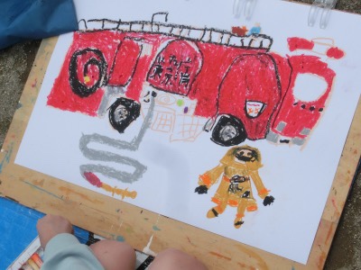 子どもたちが描いている間、消防服を着た消防士さんがずっと立っていてくれました。お疲れさまです。