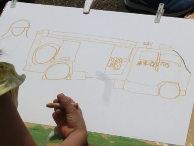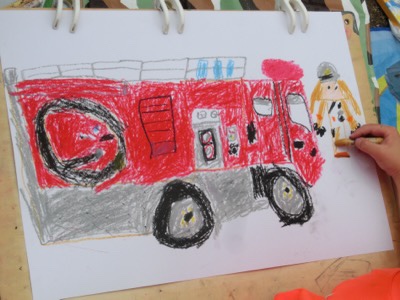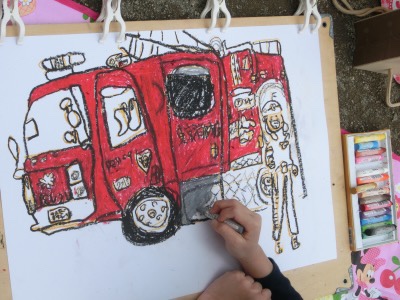はじめに薄い色のクレヨンで下書きをしています。消防車の形が上手に描けていますね。
