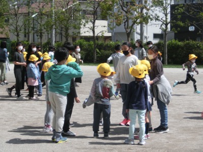 黄色い帽子の1年生に優しく声をかけて一緒に遊んでいます。