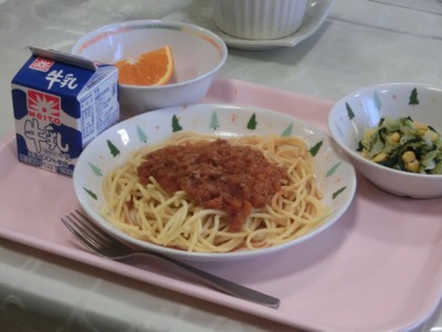 今日の給食はスパゲティミートソース。杉並区は米飯給食を推奨しているので、麺類は月に1回しか登場しません。
