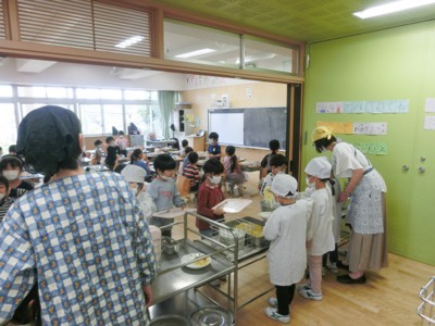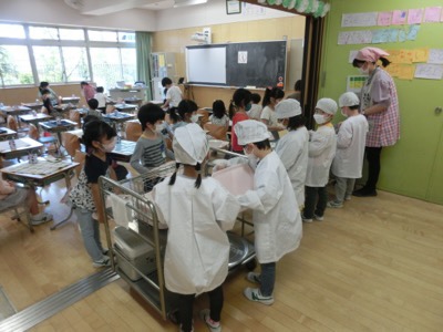 1年生の給食が先週から始まっていますが、初めのうちは、給食当番が配膳をするのはとても大変です。そこで、学校支援本部(AW)のサポーターが配膳のお手伝いをしてくれています。これは1-5の様子です。
