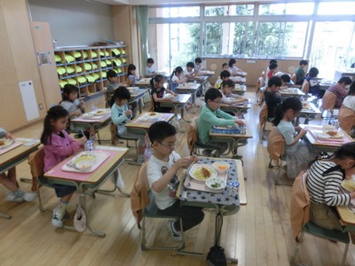 コロナ対策のため、給食は前を向いて黙って食べます。これは1-3です。1年生でも、給食時の約束が身に付いていますね。