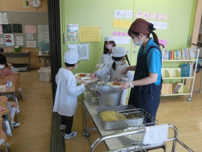 これは1-1。最後に給食当番の子どもの分を先生が盛り付けていました。