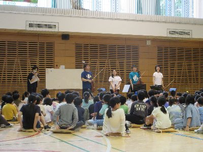 アリーナで5年生が、運動会で踊る「エイサー」の練習をしていました。担任の岡田先生がお手本を見せています。