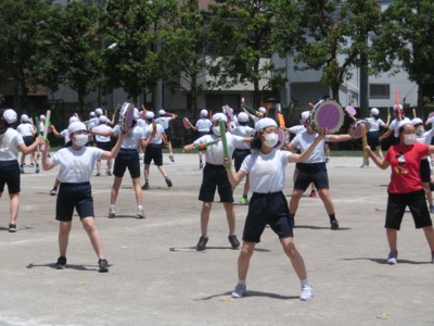 「唐船ドーイ」の曲に合わせて、校庭に手作りのパーランクの音が響きます。