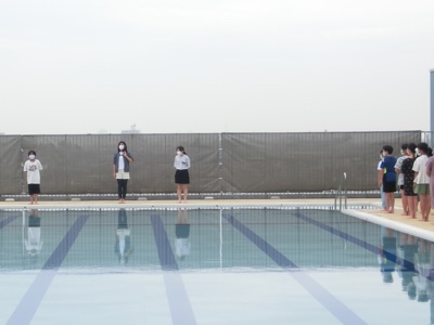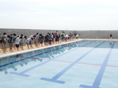 2021-07-06 6年生がプール開き 移動教室があったためなかなか水泳指導ができなかった6年生がプール開きをしました。人数制限をするために学年全員でプールには入れないので、プール開きだけ着替えずに行いました。 各クラスの児童代表が、今シーズンの水泳の目標を発表しました。 プールに一礼。 その後、着替えて学年の半分ずつプールに入りました。 Home › 6年 › 6年生がプール開き 関連記事 読み聞かせ 6年生の野点 朝のエントランス 今日の授業風景 (6年生)社会科見学 7月の委員会活動 5・6年の保護者会