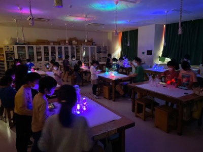 これは科学クラブです。今日は、ペットボトルとゴム風船で「空気砲」を作っていました。