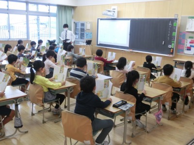 2-2は、お楽しみ会をしていました。魚つりゲームで盛り上がっていました。