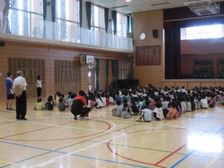 よい天気の月曜日。4-1が校庭の体育で大縄を跳んでいました。