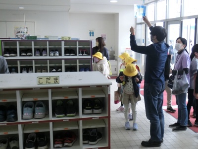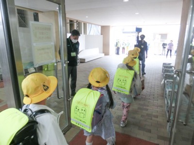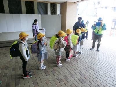 交通指導員の方と一緒に下校します。当分の間、このような手順で下校することになります。
