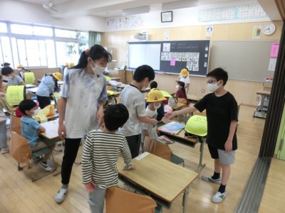 登校後の1年生のお手伝いを、6年生が続けています。交代で数人ずつ各クラスのサポートをします。1年生は、ランドセルの中から検温カードなどを取り出すのに苦労していました。