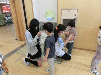 大きな6年生が、膝をついて1年生に向き合っている様子が微笑ましいですね。