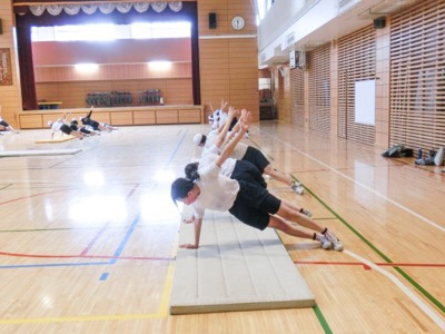 4-4もアリーナでの体育です。身体を前後の人に預けて倒れる運動をしています。